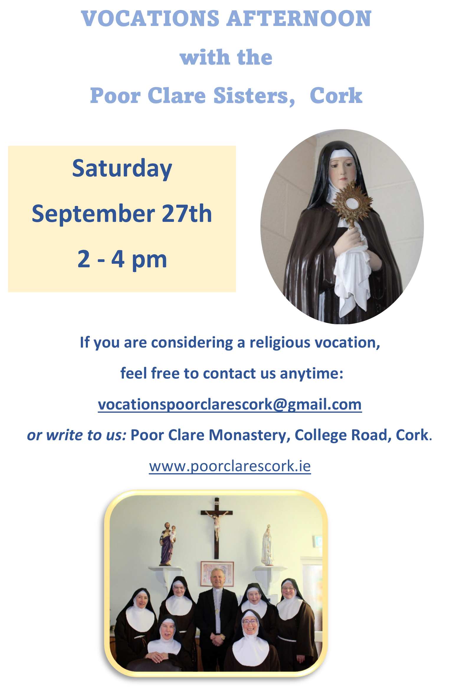 Those considering a religious vocation are invited to join the Poor Clares at their monastery in Cork for a Vocations Afternoon on Saturday, September 27 from 2-4 pm.